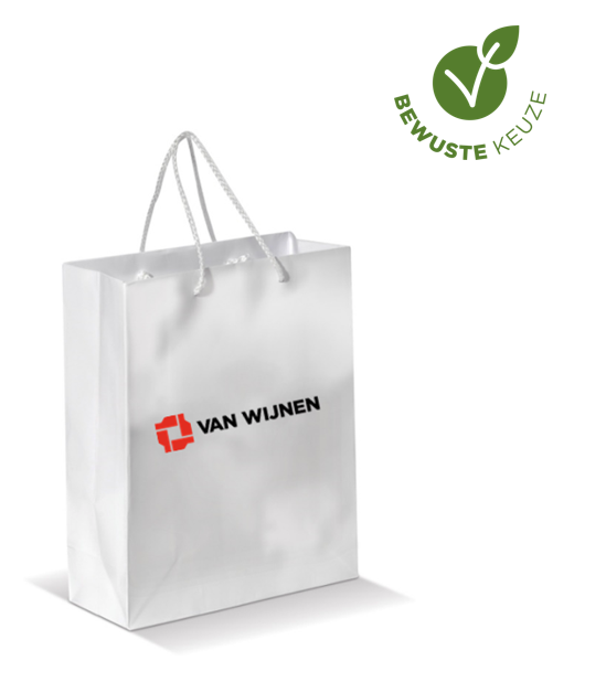 170 grams wit kraft papier. PP rope. Formaat A5 - 14,8(W)x7(D)x21(H)cm. Incl. opdruk logo Van...meer